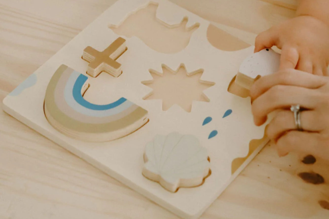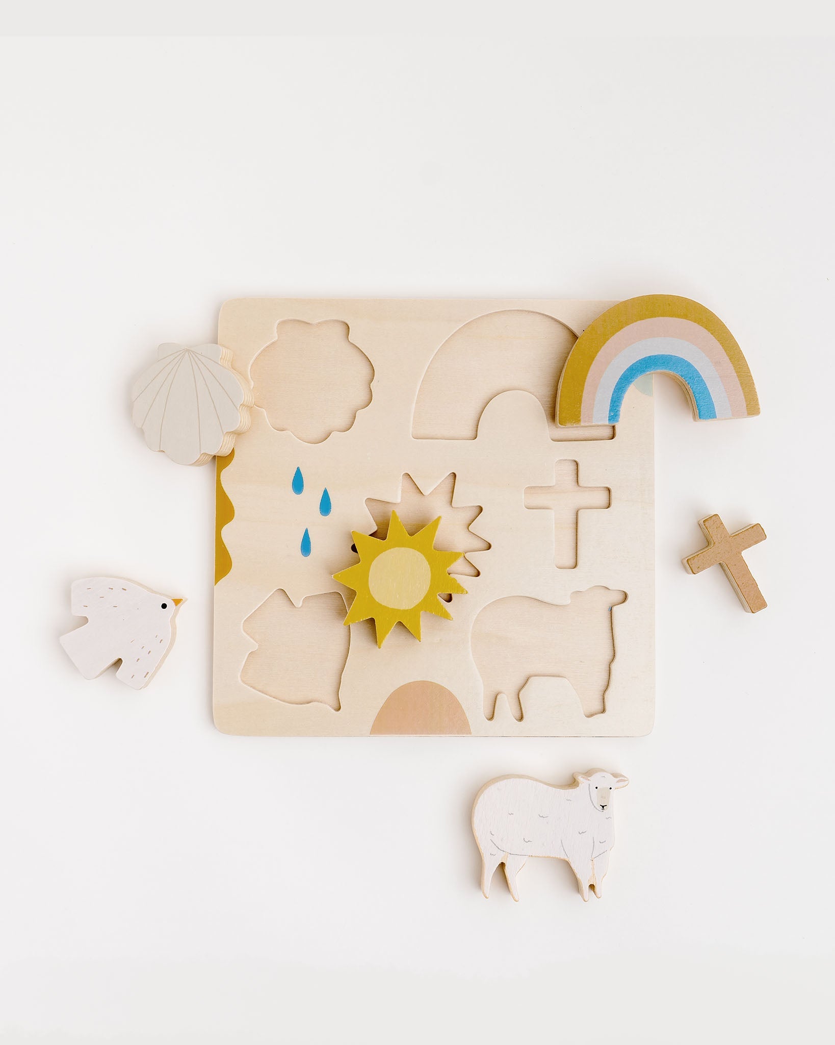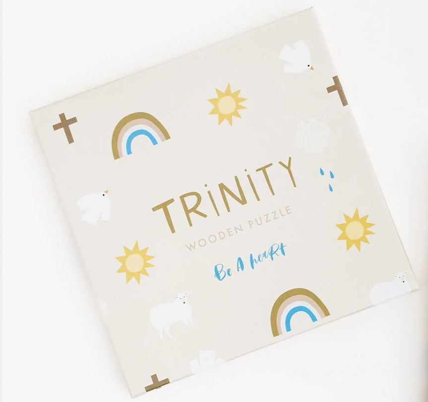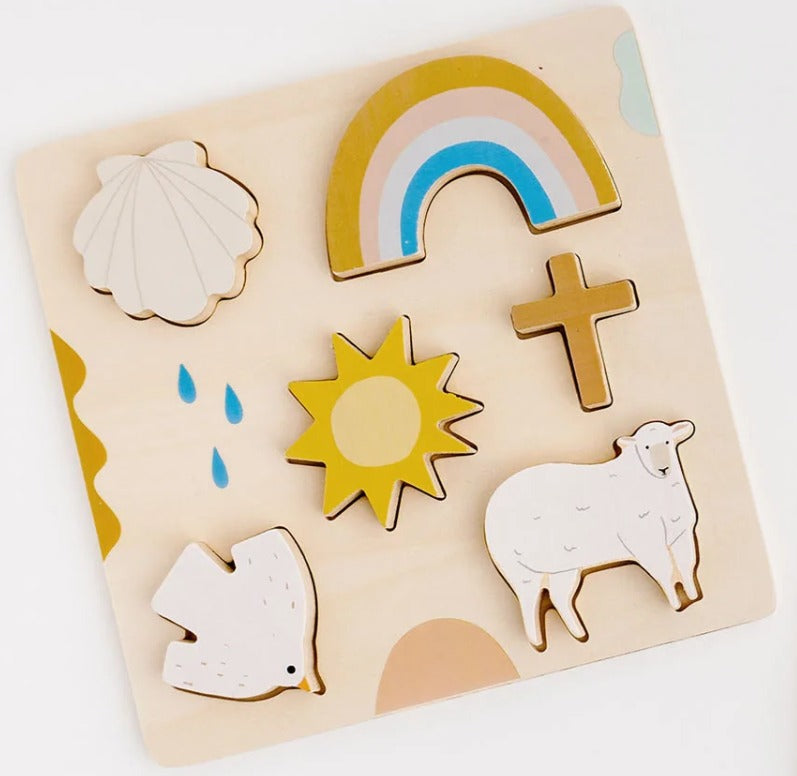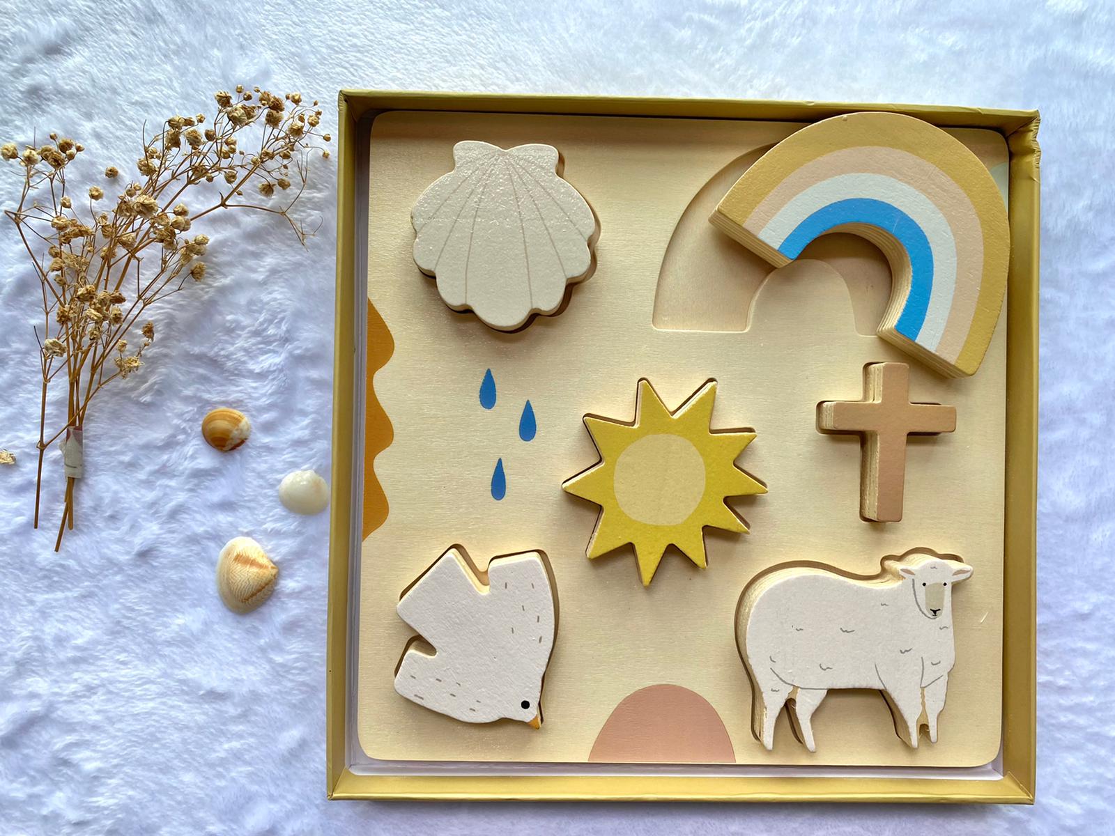 The puzzles make great baptism, birthday and Christmas gifts. The Trinity wooden puzzle, includes a sea shell, a rainbow, the sun, a cross, a dove, and a lamb.